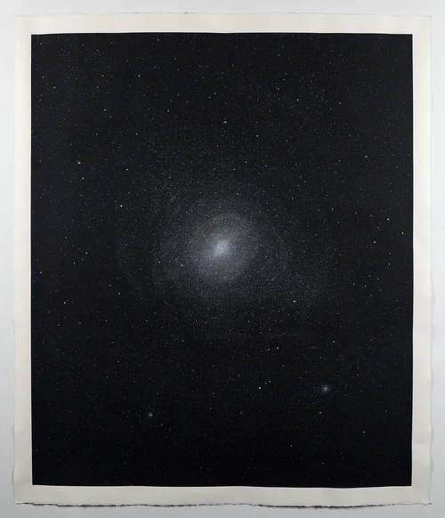 Here, the constellation Cygnus extends across the Milky Way as it would be seen in the autumn sky. The season holds particular significance, as Earth's orbit begins to turn us toward the periphery of the galaxy in autumn (in summer, we face its center). This large scale drawing invites the viewer to look into something both familiar and terrestrial - the stone - to see another realm, the celestial night sky.