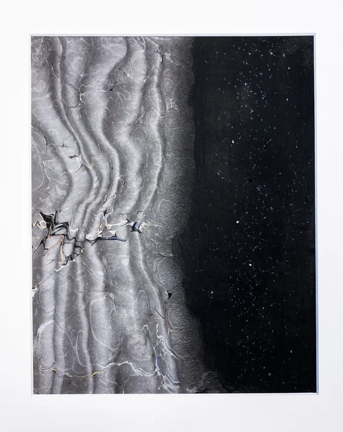 Framed by a tactile printed rock surface, the circular composition of Ferrous Form/Unform acts as a portal to the distant and intangible stars. Here, marbled paper mimics the red, iron-rich earth of Oklahoma, formed nearly 300 million years ago. The center depicts the Mice Galaxy in the constellation Coma Berenices, a system of two spiral galaxies in the process of merging. This star system is approximately 300 million light years away. The light we see from the galaxies left its stars when the dirt of Oklahoma was first formed. The light and the land meet at this point which we call now, or the present.